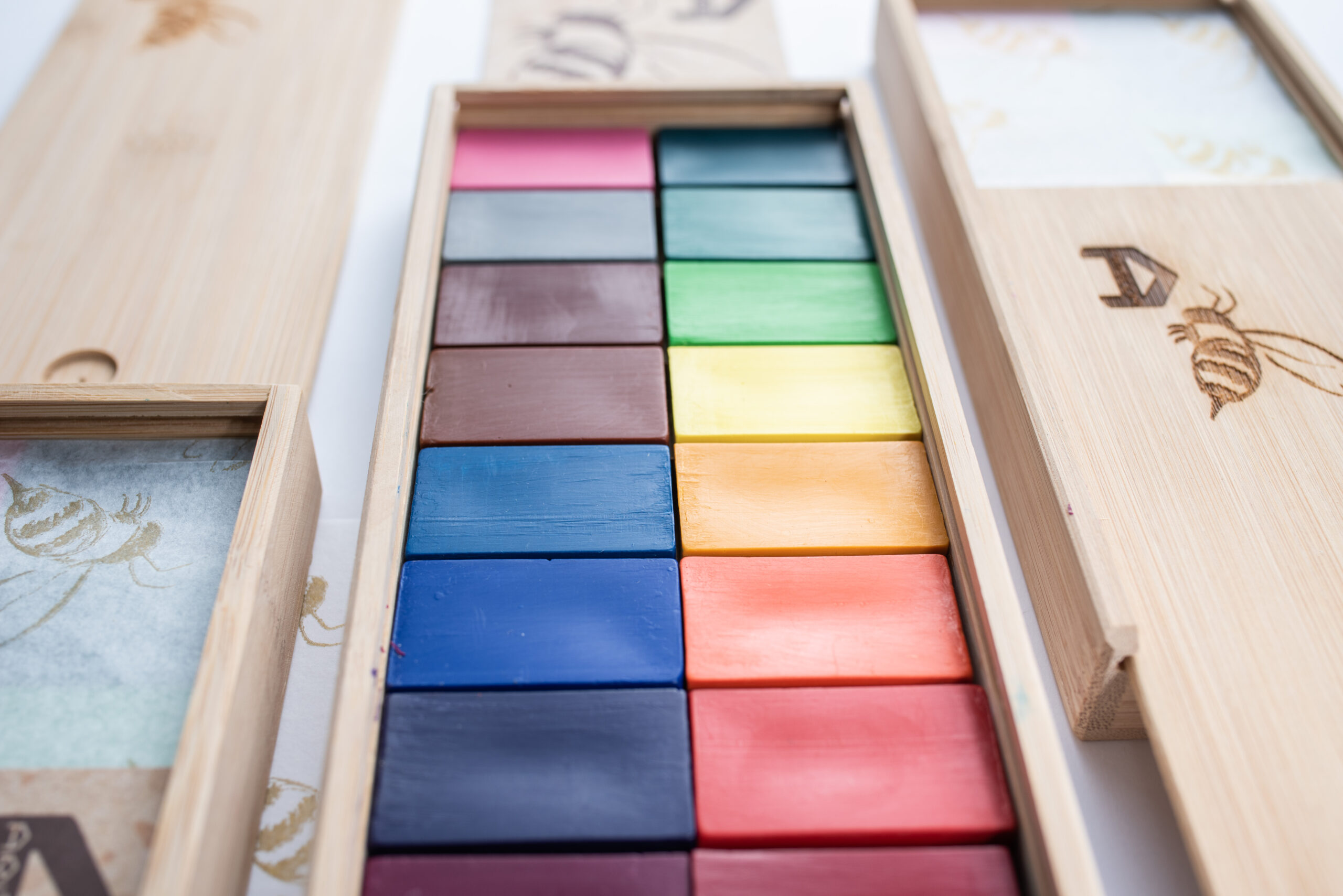 Cera de abeja de colores variados empaquetados en caja de bambú.